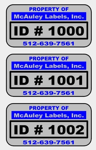 Custom designed property identification and tracking labels printed on a matte silver metalized polyester stock with a permanent acrylic adhesive. These are suitable for a wide range of temperatures and will bond well to most surfaces. These labels are printed using a highly scratch, fade, and solvent resistant ink. They are a extremely durable, long lasting product suitable for both indoor and outdoor use. The labels are weather resistant (water proof after bond achieved). The Pantone Colors (INKS) we use for labels are BLACK, BLUE 2935C, RED 185C, GREEN Pantone 347C. These colors will vary from the RGB Display Color on monitor. Once you provide your custom information, we will send you a proof requesting you to make changes as needed, or to approve. Thank you for checking our listing and feel free to contact us with any questions